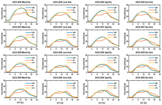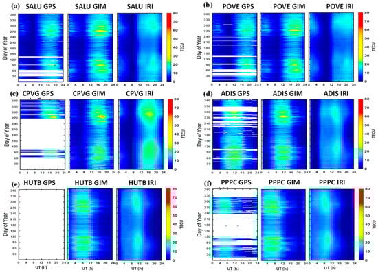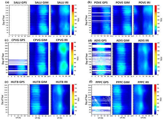 The GIM showed a similar diurnal pattern to GPS-TEC, though with slightly lower values (23 TECU) at ADIS and slightly higher values (15 TECU) at CPVG. The IRI-2016 model values, which were observed to fade away at ADIS, were in contrasting, slightly higher than those of both GPS-TEC and GIM at CPVG. In the Asian longitude (Figure 4e,f), there were no GPS-TEC observation data at HUTB (Figure 4e), but at PPPC, GPS-TEC data were available for the majority of days. From the available data, the GPS-TEC, GIM and IRI-2016 models showed similar diurnal patterns, increasing from the minimum value of 0–2 TECU at 22:00 UT (06:00LT) to the maximum value of 10–16 TECU during the pre-sunrise hour with respect to UT before reducing to the minimum value during the post-sunset hour with respect to UT (Figure 4f). We decided to be silent on the diurnal variations of the GIM and IRI-2016 at HUTB (Figure 4e) because there were no GPS-TEC observation data throughout the year.