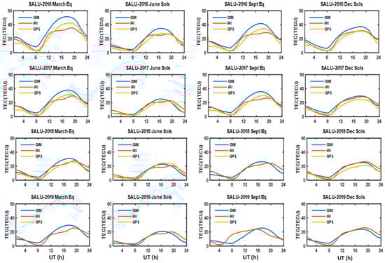 Seasonal variations in GPS-TEC, IRI-2016 and GIM models for descending (2016–2017) and minimum (2018–2019) phases of solar cycle 24 at SALU.