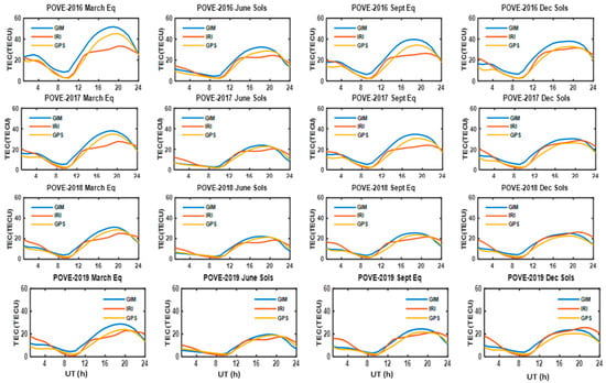 The plots for the seasonal variations in the GPS-TEC, GIM and IRI-2016 models for the descending phase years (2016–2017) and the minimum phase years (2018–2019) at SALU and POVE (American), CPVG and ADIS (African), and HUTB and PPPC (Asian) longitudes are shown in Figure 6, Figure 7, Figure 8, Figure 9, Figure 10 and Figure 11. Figure 6 and Figure 7 show the seasonal variations in the GPS-TEC, GIM and IRI-2016 models at SALU and POVE, respectively, during the descending phase (2016–2017) and the minimum phase (2018–2019) in the American longitude. At the American longitude, Figure 6 and Figure 7 show seasonal variations with higher values during the daytime than the nighttime with respect to the UT, as expected. At SALU, the seasonal variations showed semi-annual variations with higher magnitudes during the equinoxes than the solstices for both the descending and minimum phases. The seasonal profiles of GPS-TEC and GIM for all seasons were quite similar for both phases, showing a single peak that was shifted to 14:00–16:00 UT (11:00–13:00 LT). The IRI-2016 model showed a noontime bite-out profile with two unequal peaks during most seasons for both solar cycle phases, except for the September equinox and the December solstice, in which the noon bite-out profile appeared to be insignificant.