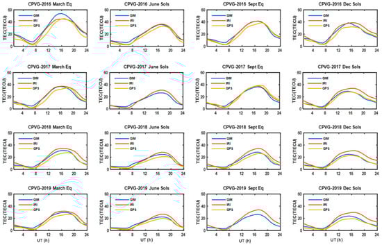 In the African longitude, during the descending phase (2016–2017) at CPVG (Figure 8), seasonal variations in GPS-TEC, GIM and IRI-2016 showed semi-annual variations, with higher values during the equinoxes than the solstices. Meanwhile, during the minimum phase (2018–2019) depicted in the Figure 8, the seasonal variations in GPS-TEC, GIM and IRI-2016 showed slightly higher values during the March equinox than the September equinox and the solstices. The differences in the semi-annual variations in the GPS-TEC, GIM and IRI-2016 models were more pronounced during the daytime between 08:00 and 18:00 UT (06:30–16:30 LT) than during the nighttime between 20:00 and 06:00 UT (18:30–04:30 LT). This shows that day-to-day variations in TEC were higher during the daytime than the nighttime. The ranges of the semi-annual variations in GPS-TEC were higher during the equinoxes (28–48 TECU) than the solstices (20–32 TECU). The semi-annual variations of the GIM and IRI-2016 models also followed a similar trend to that of GPS-TEC. The semi-annual variations of the GIM during the equinoxes and solstices were between 26 and 55 TECU and between 22 and 33 TECU, respectively. The semi-annual variations of IRI-2016 during the equinoxes were found to be higher (28–47 TECU) than during the solstices (20–39 TECU). It is equally important to mention that the highest values of the seasonal variations in GPS-TEC, GIM and IRI-2016 mostly occurred during the March equinox, while their lowest values mostly occurred during the June solstice.