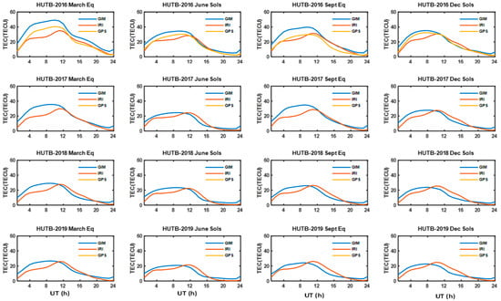 In the Asian longitude at HUTB (Figure 10), GPS-TEC values were only available during the descending phase year of 2016, making it difficult to follow the trend of GPS-TEC in comparison with GIM and IRI-2016. However, according to the available data, the seasonal profiles of the GPS-TEC, GIM and IRI-2016 models at HUTB were very similar to the seasonal profiles of the GPS-TEC, GIM and IRI-2016 models at PPPC for the descending phase year of 2016, though with slightly lower values. During the descending phase year of 2017 and the minimum phase (2018–2019), in which GPS-TEC values were not available, it was possible to estimate GPS-TEC values from the averages of GIM and IRI-2016 following the consistencies in the data used in this research. At PPPC (Figure 11), seasonal variations in the GPS-TEC, GIM and IRI-2016 models also showed semi-annual variations, with higher values during the equinoxes than the solstices for the descending and minimum phases, except for GPS-TEC values, in which the December solstice values were a little higher than the September equinox values. The shapes of GPS-TEC, GIM and IRI-2016 followed similar patterns, showing higher values during pre-sunrise to noon-time than the rest of the hours of the day with respect to UT during both phases. Additionally, the peaks of GPS-TEC, GIM and IRI-2016 occurred during the pre-noon hours with respect to UT during both phases. However, IRI-2016 was observed to show two pre-noon peaks with respect to UT. The GIM values were observed to be higher during most seasons for both phases. The maximum GIM values (37–52 TECU) during the equinoxes for the descending phase were higher than the maximum GIM values (24–32 TECU) during the equinoxes for the minimum phase. This was followed by the maximum range of the GPS-TEC values (22–43 TECU) during the equinoxes for the descending phase, which was also higher than their maximum values for the minimum phase (19–28 TECU). Lastly, the maximum values of IRI-2016 during the equinoxes for the descending phase (28–35 TECU) were higher than their maximum values for the minimum phase (25–27 TECU). At PPPC, the GIM assessment of GPS-TEC can be assumed to be weaker than IRI-2016 model predictions, since there were observed over-estimations at most hours for all seasons, especially for the descending phase of the solar cycle.