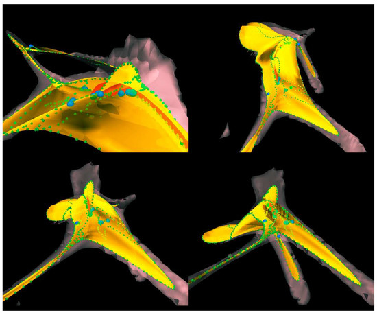 An illustration of the complexity of caustic formation that already arises in a three-dimensional inertial system. Shown are four views of the same evolution stage. Yellow surfaces correspond to caustic surfaces from the degeneracy of the first eigenvalue of the deformation tensor; red surfaces correspond to secondary degeneracies of the second eigenvalue; third degeneracies are barely visible and may occur later. A hierarchy of further nested caustics forms by including gravity. Green dots correspond to cusp singularities, while the blue dots correspond to higher-order singularities. Pink-grey shaded areas correspond to density contours. Figure by Arno Weiss [112].