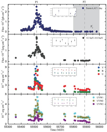 - Period 2 (P2): MJD 55,886 corresponding to the period when the lowest X-ray flux was observed, and the -ray and optical/UV bands flux are also relatively low at this time, so we take it as the quiescent states.