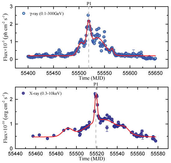 Diagram of a combination of multiple gaussians profile function fitting -ray and X-ray light curve during flare periods. The gray dashed lines in each panel correspond to the P1 epoch.