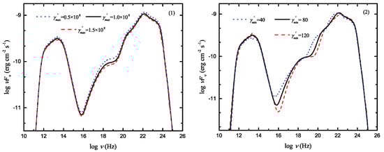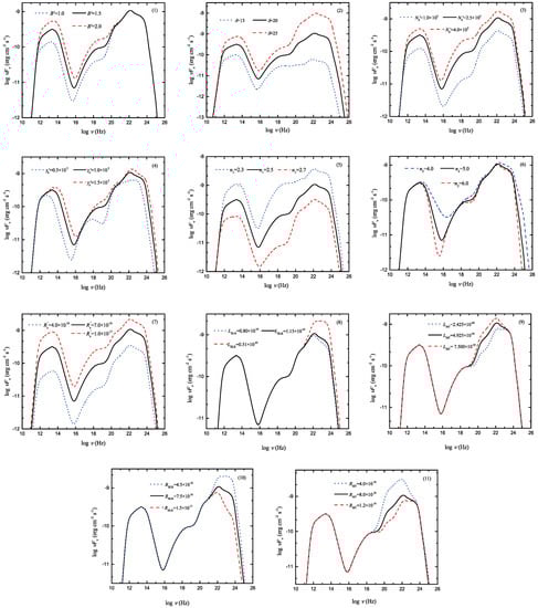 There are altogether 13 free parameters in our model: , , ,, , , , , , , , and . To centralize the influence of the individual parameter shift, we change only one parameter and keep the others fixed. We adopt , , , , , , , , , , , and as a baseline of the theoretical SED. The changes in the theoretical photon spectrum by varying the individual parameters are shown in Figure 3 and Figure 4.