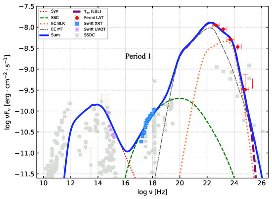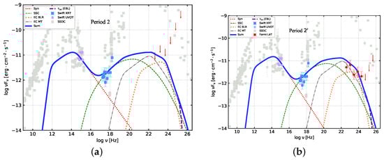 - In the first strategy, we adjust the values of all the free parameters according to the -minimum technique [12,14,78], so that the theoretical photon spectrum can conform well to the multiwavelength observation data in P1, P2 and states. In the specific fitting, is given by adjusting , , , and .