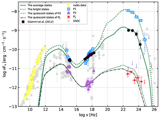 Based on the above simulation, we consider reproducing multiwavelength SED of 3C 454.3 in different activity states P1, P2 and . In general, the possible causes of the high energy -ray flares are: (1) an increase in the energy density of the external radiation field ; (2) an increase in the Doppler factor in jet; (3) the hardened distribution of radiated electrons leads to the change of ; (4) an increase in the number of relativistic electrons [38,74,75,76,77]. Therefore, we consider two strategies in the fitting to research the multiwavelength radiation property in different active states.