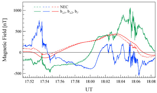 The external magnetic field components in the NEC reference frame and parallel () and perpendicular () to the local main geomagnetic field. Data refer to measurements recorded on October 25, 2016 from 17:50 UT to 18:08 UT.