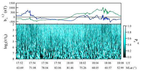 According to Gedalin and Russel [12], the wavelet transform can be applied to Equation (7) so as to obtain a polarization scalogram where is the location and the scale. In detail, if is the magnetic field vector and is the corresponding wavelet transform, where , then one can interpret as a local magnetic field monochromatic wave with and . Consequently, the circular polarization can be computed using the following relation