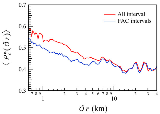 The obtained results are reported in Figure 5 where the average as a function of the spatial scale for both the entire interval and the selected FAC regions is shown. Circular polarization increases with the decrease of the spatial scale and it is characterized by a larger increase in the case of the analysis performed on the entire interval, especially for km. It is interesting to observe taht at scales greater than 7 km there is no difference in the circular polarization when looking at the entire interval or just FAC regions. The observed features suggest that the main contribution of FACs’ structure to circular polarization is essentially at scales shorter than 7 km. At scales greater than 7 km the similarity may be due to similar magnetic structures, such as macroscale field-aligned coherent flux tubes.