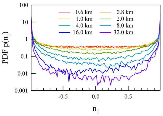 The probability density function (PDF), , for a selected number of spatial scales, .