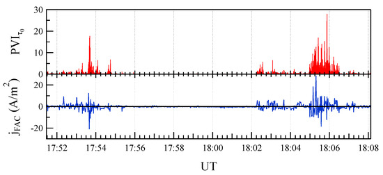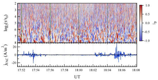 Figure 13 shows computed at the smallest available timescale s ( m) in comparison with during the selected time interval. There is an excellent agreement between and supporting the idea that the satellite is crossing a turbulent plasma region characterized by a complex filamented network of currents at the boundaries of field-aligned magnetic structures. Large values of corresponding to the crossing of FAC regions suggest the existence of relevant magnetic discontinuities localized in the regions where currents flow. We point out that the observed discontinuities can be both tangential/rotational and compressional based on definition.