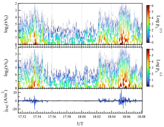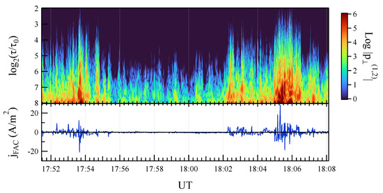 Upper panel: The scalogram, of , in the plane perpendicular to the local main geomagnetic field. Unit is . Lower panel: the FAC density, .
