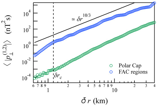 The observed scaling reminds that of magnetic helicity observed in the case of homogeneous MHD helical turbulence by Mininni and Pouquet [16], which is observed to scale as (see also [17,18]). This confirms that the reduced polarization energy can provide some insights on the magnetic helicity spectrum. Indeed, according to Stribling et al. [10] in the case of a circularly polarized Fourier component, , the magnetic helicity , so that in terms of power spectral density we have . This means that for a magnetic field characterized by a power law spectral density , the magnetic helicity spectrum is expected to scale as . In our case, as shown in Consolini et al. [6], the magnetic field PSD is characterized by a scaling exponent , so that for the magnetic helicity spectral density the spectral exponent should be , a value which is quite well in agreement with the observed exponent of the reduced polarization energy in the FAC regions. Furthermore, we observe a break in the FAC reduced polarization energy spectrum at a scale of about km, which could be a signature of a new physical process occurring at this scales. This break is not present in the case of polar cap spectrum, which is characterized by a single spectral regime , with .