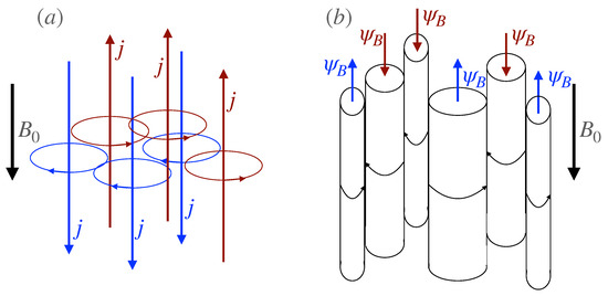 A schematic picture of the two possible scenarios. Panel (a): a complex current structures consisting of multiscale upward and downward current filaments. Panel (b), a complex multiscale structure of coherent magnetic flux tubes aligned to the main geomagnetic field .
