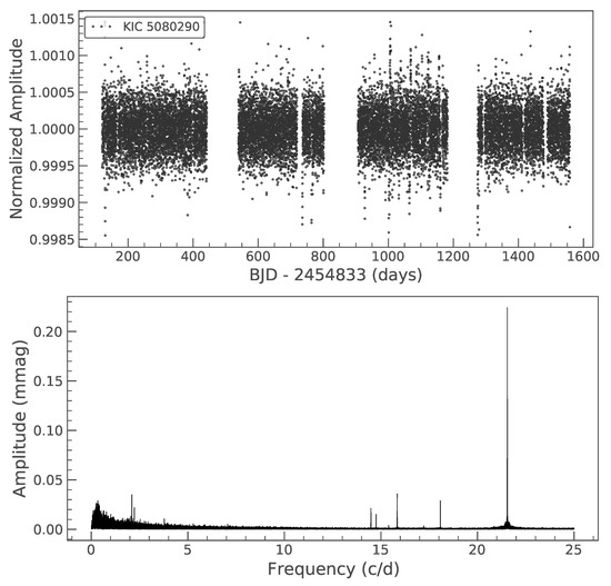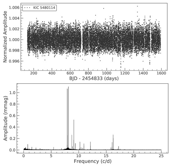 - Balona, L.A.; Dziembowski, W.A. Kepler observations of δ Scuti stars. Mon. Not. R. Astron. Soc. 2011, 417, 591. [Google Scholar] [CrossRef]