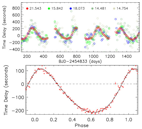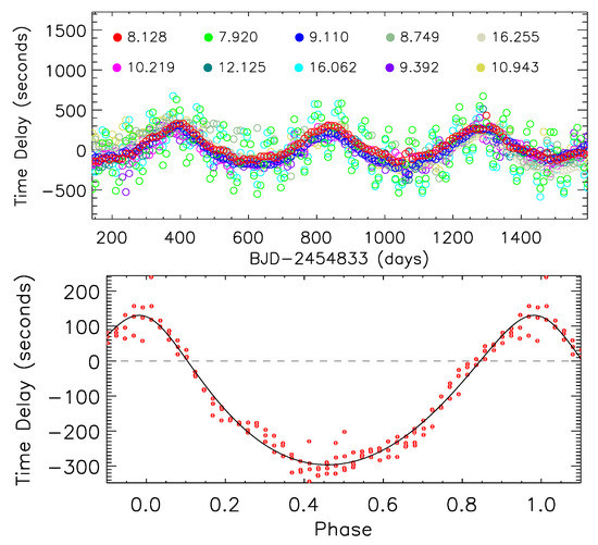 - Balona, L.A. Binary star detection using the time-delay method: Application to 34 Kepler objects of interest. Mon. Not. R. Astron. Soc. 2014, 443, 1946. [Google Scholar] [CrossRef]