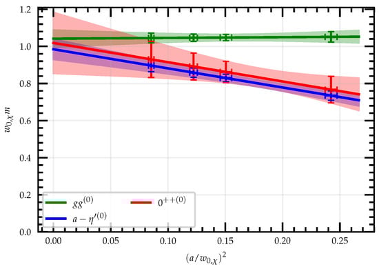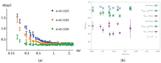 The most well studied theory in this context is SU(2) adjoint QCD with two Dirac flavors (Minimal Walking Technicolor, MWT). In this case, the flavor content is just large enough to enable a coupling to the standard model, and first perturbative estimates have concluded that it should be near-conformal. A rather large number of numerical investigations have been carried out for this theory, including the particle spectrum, the running of the gauge coupling, and the mass anomalous dimension [60,61,62,63,64,65,66]. These studies have indeed found good agreement with infrared conformality. As expected, the masses scale to zero in a way determined by a common mass anomalous dimension, which implies constant mass ratios. The lightest particle is a scalar state and not the pseudo Nambu–Goldstone bosons (pNGbs). An example of the results is shown in Figure 3. The anomalous dimension obtained in [64] seems to be quite low compared to the expectations for a walking technicolor scenario.