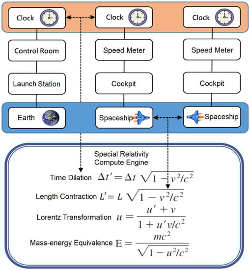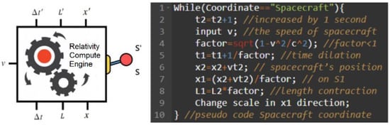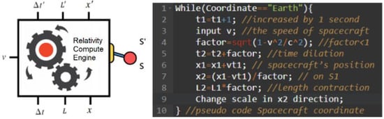 The design of the relativity compute engine is based on the formulas of time dilation, length contraction, Lorentz transformation and mass–energy equivalence. S represents the Earth coordinate system and S’ represents the spacecraft coordinate system, and their X-axis and X′-axis overlap. When the spacecraft is moving along the X′-axis with a speed v, the observer on Earth will see the clock in the control room running normally but the clock in the spacecraft is slower due to time dilation, i.e.,