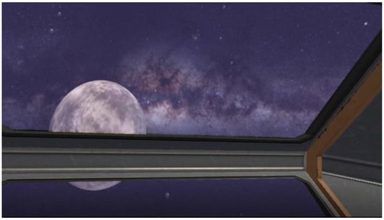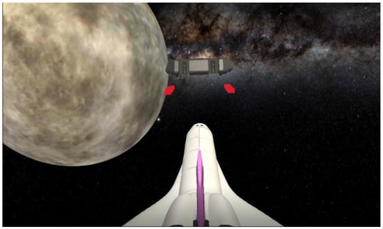 If the learner answers a question incorrectly, they can choose to answer it again by reading the learning content on the screen of the control room for verification. After answering all questions correctly, the learner can enter the spacecraft to start the exploration mission. The rocket will carry the spacecraft slowly up into the sky, out of the range of gravity, and finally into outer space (Figure 8). The learner can adjust the speed and direction of the spacecraft and drive it towards the destination.