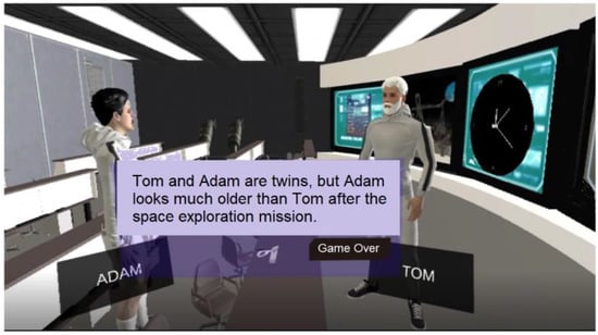 The learner can confirm understanding the concepts of special relativity and mass–energy equivalence by answering questions in each stage of the mission. After the spacecraft returns to Earth, the learner can observe the clocks in the spacecraft and the control room as well as the appearance of the ground staff (Tom), who looks much older than the spacecraft pilot (Adam) even though they are twins (Figure 12).