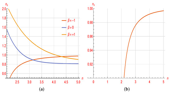 Furthermore, using the values obtained for slow-roll indices, and according to the Hubble rate given in Equation (19) and with straightforward calculations as well as simplifications, the values of these indices can be obtained. Additionally, by using the values of slow-roll indices and even the Hubble rate, we obtain the scalar spectrum index (12) and the tensor to the scalar ratio (14). By performing some manipulations and then calculations, the variation rate of these variables concerning n and are shown in the figures. We also describe these results. As you can see in Figure 1, we plot the rate of change of the scalar-spectrum-index () in terms of the , concerning the different values for the component of (n) and concerning the constant values of the parameters such as , , and . These free parameters () associated with the model have already been calculated by Ref. [46]. Additionally, they obtained the slow-roll parameters and the most important cosmological parameters, such as the scalar spectrum index and tensor-to-scalar ratio, in Einstein’s frame according to the slow-roll conditions. The cosmological parameters were a coefficient of n, and applying the latest observable data challenged the changes of these important cosmological parameters according to the swampland conjectures. It was found that the logarithmic model is aligned with the latest observable data. Here too, we studied the compatibility of the scalar spectrum index in terms of parameter and for different values n. The compatibility points are specified for specific ranges in the figures. Of course, the changes of these parameters in terms of parameter n and with respect to are also plotted, which shows an acceptable range for this cosmological parameter. This consistency was determined for different values of the parameter n in [46] for the Einstein frame. Of course, the acceptable range for other cosmological parameters, i.e., the tensor-to-scalar ratio r for various values of n in [46] and also for the desired model in Jordan’s frame in the upcoming work, is also discussed in separate figures. It is possible to compare the compatibility of these two important cosmological parameters according to two different frameworks. In general, in both frames, a specific range is specified for the constant parameters that are consistent with the observable data. Additionally, the changes in this index in terms of (n) are well defined according to the parameter in Figure 2. As shown in Figure 2b, for , the correct range of this index is displayed, which can be compared with the observable data.