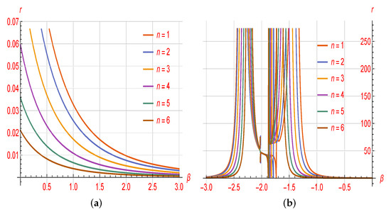 The plot of r in terms of in the plot (a) and in the plot (b) with respect to various values of n and constant parameter , , and .