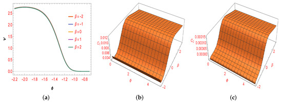 The plot of V (a), (b), and (c) in term of with respect to different values of , and the constant parameter , , and .