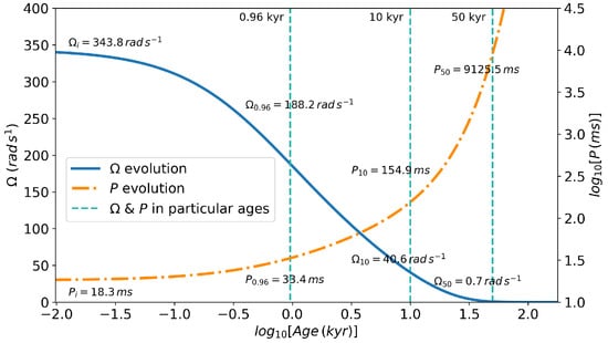 which is plotted in Figure 1 and shown in Table 1, together with the other related parameters at different ages. To test the validity of this analytic solution Equation (13), we process it by the Taylor expansion, then acquire the two special solutions, respectively, for the pure dipolar case with and the pure non-dipolar case with , where denotes the initial angular frequency. For more details about the derivation of our model, please see Appendix D below.