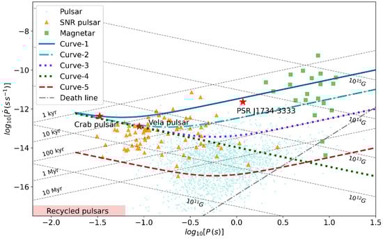Diagram of the derivative of the spin period versus spin period ( diagram). The solid curve (Curve-1) stands for the evolutionary track for the Crab pulsar with G and s−1. The dash-dotted line (Curve-2) and dotted line (Curve-3) represent the situations with the conditions and and and , respectively. The dark-green-dotted line (Curve-4) is the MDR evolution curve with the parameters and . The dashed line (Curve-5) is plotted with the values of and . The light-dash-dotted line represents the death line for the pulsar ceasing its radio emission [22,50]. The light-dashed lines stand for the different characteristic age and B-field, respectively. The data were taken from the ATNF Pulsar Catalogue [4]. The red stars represent particular pulsars, including the Crab pulsar, the Vela pulsar, and PSR J1734-3333. Below the symbol “Recycled pulsars” are those experienced the binary accretions [22,73,74].