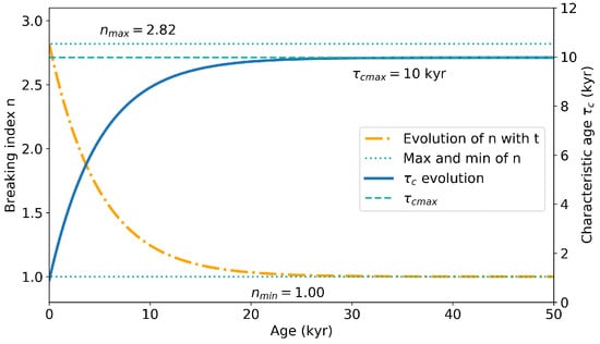 which satisfy the condition of d + f = 1 that is the core assumption of the model. We proceed by submitting the spin derivative Equation (4) into the braking index Equation (1), and obtain a relation