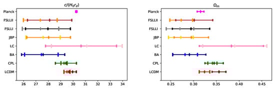 Since we avoid the degeneracy between and by considering the combined quantity this leads to an explicit correlation with for some models and rather strict bounds on the error. The values of closest to the ones published by Planck 2018 [] are for the BA, JPB and FSLLI models for the BAO dataset and CDM1 and BA for the BAO+SN+GRB. The rest significantly overestimate . For the ratio Planck 2018 gives , the closest models are BA, JPB and FSLLI/FSLLII models for the BAO dataset and (flat) CDM, JPB and FSLLI/FSLLII for the BAO+SN+GRB. For , the Planck 2018 values is . Here, the models closest to this value are CDM, CPL and LC for the BAO dataset and CDM, CPL and LC for the BAO+SN+GRB.