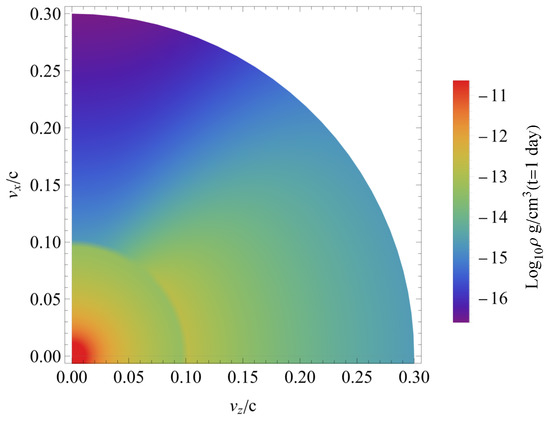 which can be normalized by the masses of the disk wind ejecta and the dynamical ejecta , respectively. This 2D distribution of the density of the merger ejecta in the plane is shown in Figure 1 for the parameter values of Model A listed in Table 1. An axial symmetry around the z-axis is adopted. Here, the maximum radii of the ejecta components are determined by