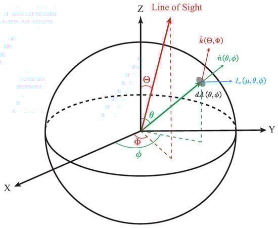 As illustrated in Figure 2, we adopt coordinates with the z-axis along the symmetric axis of the system and denote the zenith and azimuth angles by and . Then, the specific luminosity for an observer on the line of sight (LOS) of can be obtained by integrating the specific intensity over the visible photosphere as
