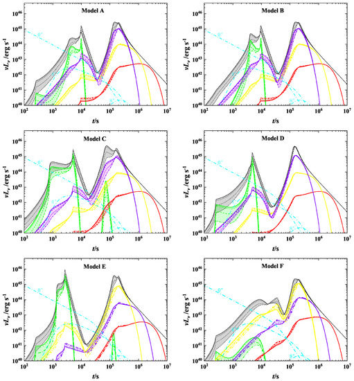 where , and are the polar magnetic filed strength, radius, and spin period of the magnetar. Here, the convention is adopted in cgs units. The reference values of the parameters in the above expression are adopted by according to the inference from the shallow-decay and plateau afterglows of GRBs by ascribing these afterglow features to the consequence of a magnetar engine [73,74,75,76]. Nevertheless, the fitting of the mergernova AT2017gfo, which is in counterpart with the GW170817/GRB 170817A event, indicates that the magnetic filed of the remnant NS on a timescale of days could be not much higher than G [20,21], if such a NS indeed played a role in there as supposed. By combining with these two different observational constraints, Yu et al. (2018) suggested that the ultra-high magnetic field of the remnant magnetar could be suppressed drastically by some unclear mechanisms (e.g., hidden by fallback material) at a time of a few hundreds to thousands of seconds [20]. This assumption could also be supported by the discovery of an extremely steep decay following a plateau in some GRB afterglows. In any case, for simplicity, here we would not consider this potential complex in our calculation, and the temporal evolution of the wind luminosity is adopted to be as usual as