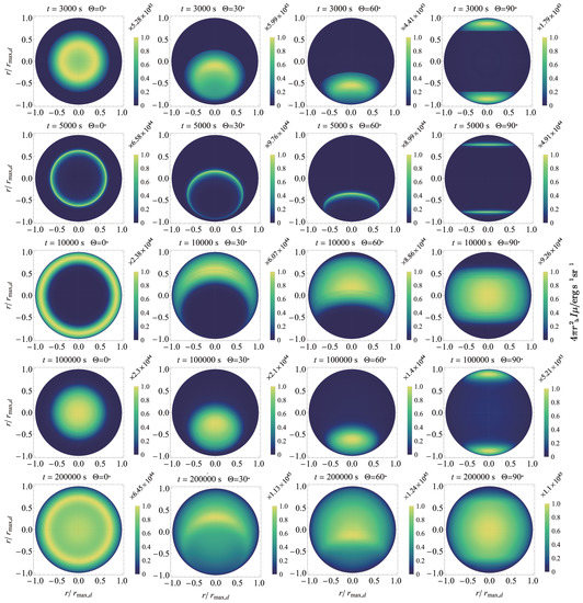 which is viable for an unresolved emitting source [79,80,81,82], where with and being the unit vectors of the normal of the differential solid angle and the direction of the LOS, respectively. For an ideal black-body surface, the angular distribution of emergent intensities is uniform and, thus, the value of can in principle be derived from Equation(19) to . However, as a more realistic consideration, the hot, expanding ejecta should contain an abundance of free electrons, especially, in the fastest head of dynamical ejecta. In other words, the atmosphere above the photosphere can deviate from the thermal equilibrium and become scattering dominated. In this case, the limb-darkening effect needs to be taken into account, which is widely discussed in the radiation transfer of stellar atmosphere [83,84,85]. Here, we simply consider pure isotropic scattering, which leads the emergent intensities to be different for different directions as [83,84,86]