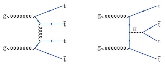 Four top-quark events can be produced with a virtual Higgs boson as mediator. So the production rate is sensitive to the value of the coupling between the top quark and the Higgs boson () [,]. The advantages of the process lie in the fact that it does not rely on any assumption on the Higgs width and that its cross section is proportional to the fourth-power of the top Yukawa coupling. It can also be used to probe the CP nature of . In addition to the and processes, production can then help to shed valuable light on the Higgs boson properties.