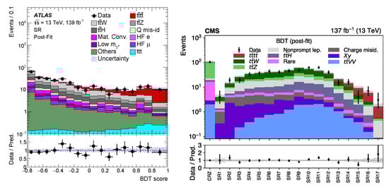 Comparison between data and prediction after the fit for the distribution of the BDT score in the signal region of the ATLAS multi-lepton analysis [] (left), and for events in the CR and SRs of the CMS BDT-based multi-lepton analysis (right) [].