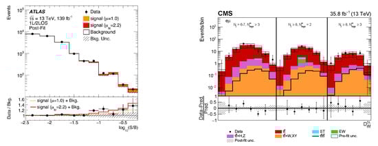 Observed and expected event yields as a function of where S and B are the post-fit signal and background yields in the single-lepton and opposite-charge dilepton ATLAS analysis [] (left). Post-fit and observed distribution of the event-level BDT in three separate signal-enriched regions in the final state, from the single-lepton and opposite-charge dilepton CMS analysis on the 2016 data (right) [].