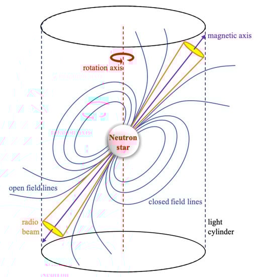 As of now, there is no fully self-consistent pulsar emission model capable of explaining the structure of the magnetic field and the time-variable phenomena [7,8,9]. Nevertheless, the simple magnetic dipole model allows a basic understanding of pulsar magnetosphere and the coherent radio emission in pulsars [10,11,12]. As illustrated in Figure 1, an induced electric field exists throughout the magnetised neutron star as a result of its rotation. Under this circumstance, charged particles are lifted out of the solid crust of the star, filling the magnetosphere with a dense plasma [13]. These particles are accelerated to relativistic velocities, and emit -ray photons by either curvature radiation or inverse Compton scattering on lower energy photons [14,15,16]. And then, the photons interacting with the magnetic field forms electron-positron pairs [17]. Near the neutron star’s polar caps, the flow of particles creates electric currents that produce the observed radio beams. Light cylinder is an imaginary surface at which co-rotation of the closed dipolar magnetic field lines with neutron star breaks-down and field lines open up to space. At light cylinder radius with P being the rotational period of the underlying neutron star the plasma speed reaches the speed of light c. The currents flowing out from the magnetosphere along the open field lines that cross the light cylinder, as well as the pulsar wind of plasma, exert a torque on the magnetic field lines which then slows the rotation of the neutron star. There is still a lack of reliable observational evidence and theoretical models to accurately describe the coupled magnetic, thermal and spin evolution of pulsars [18,19,20,21]. Fortunately, there is a powerful approach known as “pulsar timing”, which helps to obtain the accurate information on the pulsar spin-down and refine existing radiation models.