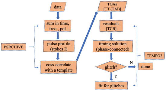 For decades, the usual procedures of data reduction for radio pulsar glitches are as shown in Figure 2. The two key steps are the measurements of the TOAs and implementation of phase-connected timing residuals. The popular pulsar data analysis packages psrchive [34] provide functionality for generating TOAs; and then, these TOAs are used to fit with a model that contains a set of known parameters to achieve a phase-coherent timing residuals (, where N is the nearest integer to ) [35], using softwares such as tempo [36], psrtime [35], tempo2 [35], and pint [37]. tempo2 remains by far the most popular software packages in the bunch of pulsar timing tools. Using these tools, the substantial manual efforts are required to obtain a satisfactory phase-connected timing residuals. Until recently, Freire et al. [38] and Phillips et al. [39] have developed new automated algorithms, DRACULA and APT, to determine phase-connected timing solutions for pulsars. Therefore, pulsar glitches can be identified via visual inspection with the sudden phase discontinuity in the timing residuals relative to a solution based on earlier data. Glitches manifest as timing residuals becoming increasingly negative with time and new models are needed for post-glitch behaviours. In the case of frequent occurrence of glitches with particularly large sizes, it is almost impossible to obtain good post-glitch timing solutions. Melatos et al. [40] presented a complementary method to this problem in the form of the Hidden Markov Model (HMM) algorithm, which measures the permanent changes in spin frequency and spin-down frequency during glitches with a HMM. Dunn et al. [41] employed HMM to analyze low-cadence timing data to constrain the magnitude of missing glitches in pulsars. Singha et al. [42] presented a real-time automated glitch detection pipeline (AGDP) that enables statistical tests to determine phase coherence between TOAs and has been implemented at the Ooty Radio Telescope (ORT) to recognise glitches automatically. Soon, the searching techniques of glitches with massive human intervention will be consigned to the past.