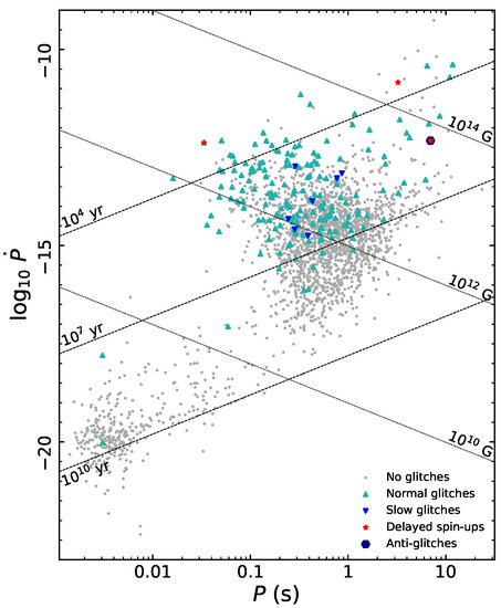 Period–period-derivative () diagram showing the pulsars for which glitch is detected based on the ATNF Pulsar Catalogue [31]. The various sub-classes of glitching pulsars are represented by the markers in the legend.