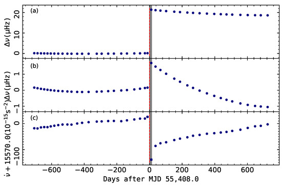 The PSR J0835–4510’s (Vela pulsar) July 2010 glitch with an exponential decay timescale of (marked grey area) observed by the Fermi-LAT [30,101]: (a) the variations in spin frequency after subtracting the pre-glitch timing model; (b) expanded plot of where the mean post-glitch value has been subtracted from the post-glitch data; (c) the evolution of . The vertical line indicates this glitch epoch at MJD 55,408(1).
