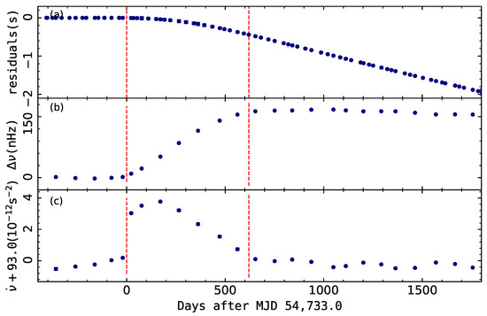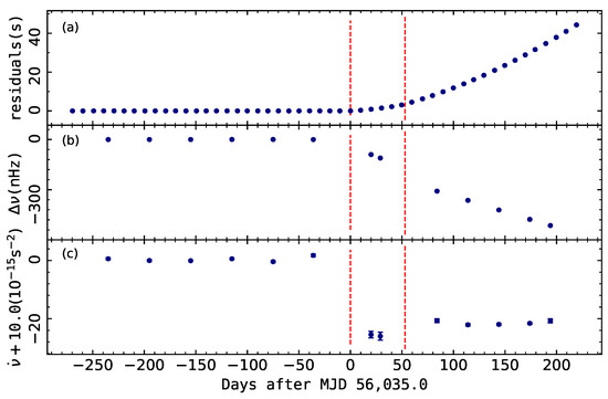 A very large slow glitch in PSR J1062–5100 [102]: (a) timing residiuals with respect to the pre-glitch spin-down solution; (b) variations of the frequency residual after subtracting the pre-glitch spin-down model. (c) observed variations of . The two red dashed vertical lines indicate that the slow glitch occurred between MJD 54,733 and 55,330.