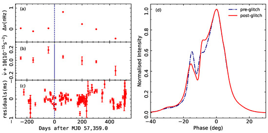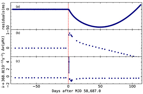 The known glitching pulsars are shown on the the period–period-derivative () diagram in Figure 3. Almost all published glitches were identified by visual inspection of the phase residuals, relative to a predicted model. Glitches with fractional sizes of ∼ do not lose phase coherence over several hundred days, while those with sizes ∼ may see a change in residuals of a large fraction of the pulse period in just a few days [69]. Once the glitch has been determined, groups of TOAs that overlap are fitted to demonstrate the time evolution of and around the glitch. To illustrate the permanent and transient jumps in one glitch, the time-dependence of the frequency residuals relative to the pre-glitch spin-down model are generally presented as in Panel (a) of Figure 4. Also, an expanded plot of frequency residuals where the mean post-glitch value has been subtracted from the post-glitch data is derived to clearly show the exponentially changing components, as seen in Panel (b). The variations of spin-down rate is visualized in detail as shown in Panel (c). Janssen & Stappers [70] found that the minimum glitch size could be detected with a threshold of ∼ by performing Monte Carlo simulations to test the glitch detection method on PSR J0358+5413 [71]. The millisecond pulsar J0613–0200 has suffered a glitch with a size ∼, which is the smallest that has been recorded [72]. Several studies have indicated that the previously published pulsar timing results did not include all glitches in individual pulsar or in particular datasets [70,73,74]. The following reasons may result in incomplete observations of glitches: