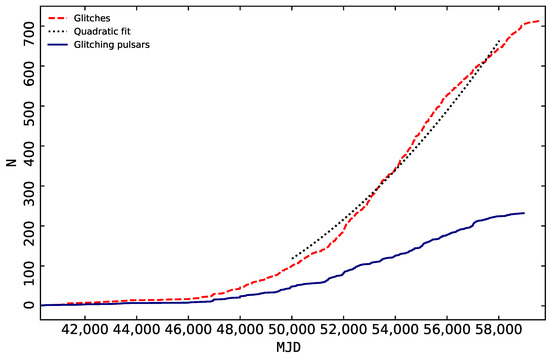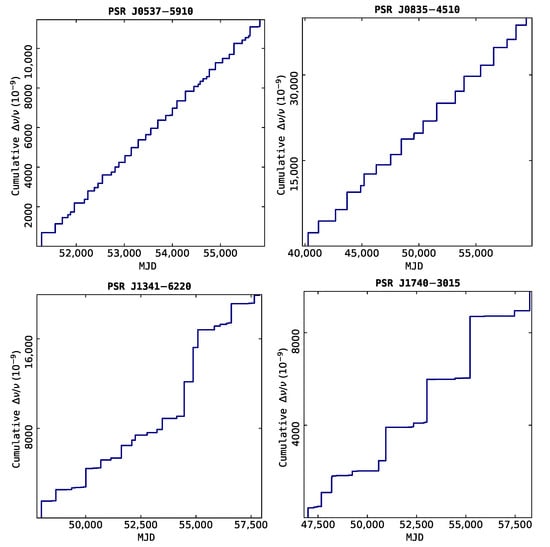 However in an actual long term observation, it is not always the case. The slow-down law of pulsars predicted by Equation (1) is generally perturbed by two types of timing irregularities: timing noise and glitches [26]. Timing noise is a slow, long-term, discernible, stochastic wandering in the periods of pulsars. In 1969, two independent groups, Radhakrishnan & Manchester [27] and Reichley & Downs [28] presented the first ever observation of a sudden increase in PSR J0835–4510’s (Vela pulsar) spin frequency , known as “glitch”. Obviously, for some pulsars pulse arrival times are not well predicted by the simple spin-down model, reflected in the observed irregularity of the pulsar’s rotation. The discovery of glitches have naturally raised the curiosity to search for more similar events using telescopes around the world. Now, high cadence monitoring of an exceedingly large number of pulsars are conducted by the northern and southern hemisphere radio telescopes: 76-m Lovell [29] and 64-m Parkes [30]. Most of glitches are detected with these two telescopes. A database of all known pulsar glitches is regularly updated in two different locations: one at ATNF (https://www.atnf.csiro.au/people/pulsar/psrcat/glitchTbl.html—accessed on 30 September 2022) [31] and also by Jodrell Bank (JBO) (http://www.jb.man.ac.uk/~pulsar/glitches/gTable.html—accessed on 30 September 2022) [32]. After combining entries from both the catalogues there are a total of 719 glitches identified in 239 pulsars [33]. As will be seen in Section 3 below, these glitches can be further classified into four subclasses of normal glitches, slow glitches, glitches with delayed spin-ups, and anti-glitches.