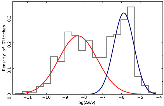 - Fuentes, J.R.; Espinoza, C.M.; Reisenegger, A. Glitch time series and size distributions in eight prolific pulsars. Astron. Astrophys. 2019, 630, A115. [Google Scholar] [CrossRef]