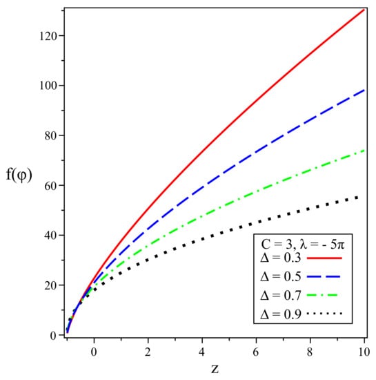 In [103], we can see the existence of the estimating solution for the dilation and marked that the solution resembles = constant for this case, which exhibits solution . We obtained the results by the dilation field, and the comparison with the EoS parameter of BHDE is consistent with the results found in [103]. We plotted the graph in Figure 7 for the dilation scalar field, where Figure 7a represents the positive scalar field and Figure 7b represents the negative scalar field. Fundamentally, we can witness the similarity in comparing the appeared dilation field with the point of k-essence, as shown in Figure 3. The version of the dilation field corresponds to [104]. We can depict in terms of and upon substituting from Equation (30) and operating Equations (11) and (31) in Equation (29).