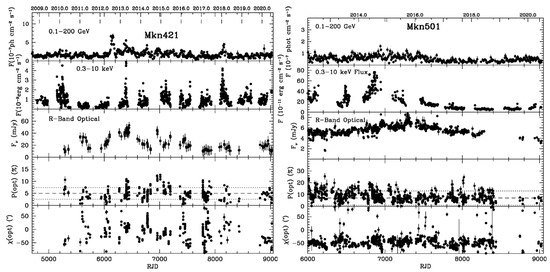 Recently, X-ray linear polarization measurements have been made possible by the Imaging X-ray Polarimetry Explorer (IXPE) mission [29]. IXPE detected polarization of both Mkn421 [30] and Mkn501 [31] over the energy range of 2–8 keV in 2022. In the case of Mkn501, Px = 10 ± 2% and χx = 134° ± 5° during one 2-day measurement and Px = 11 ± 2% and χx = 115° ± 4° during another 2-day pointing 18 days later. During the same epochs, the optical polarization was Po = 4 ± 1% and χo = 119° ± 9° and Po = 5 ± 1% and χo = 117° ± 3°—similar in position angle but a factor of 2–3 times lower than the X-ray degree of polarization. The IXPE measurements of Mkn421 give Px = 15 ± 2% and χx = 35° ± 4° over 2 days, when Po ranged from 1% to 3%, with χo between 21° and 57°. For both blazars, the optical and X-ray position angles were therefore similar, while the X-ray degree of polarization was many times higher than the optical value.