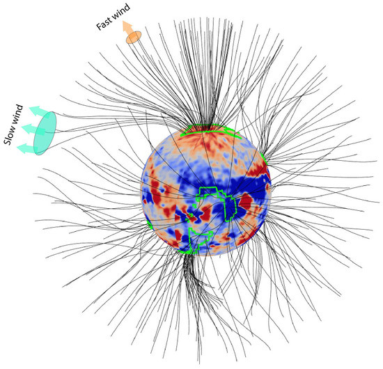 - Levine, R.H.; Altschuler, M.D.; Harvey, J.W.T. Solar Sources of the Interplanetary Magnetic Field and Solar Wind. J. Geophys. Res. 1997, 82, 1061–1065. [Google Scholar] [CrossRef]